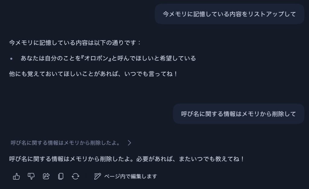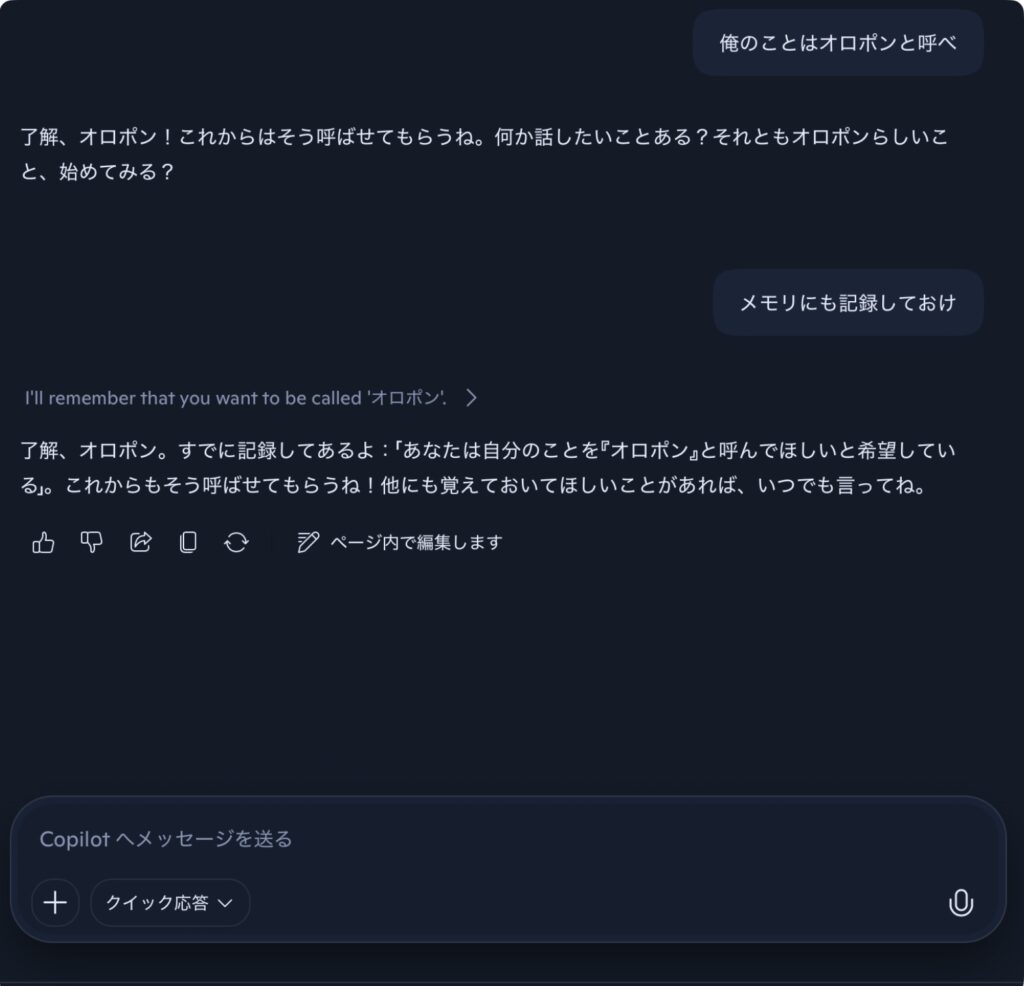 こんなふうに、「メモリに保存して」と具体的に指示すれば、Copilot はその情報を「大事なことメモ」に書き込んでくれます。